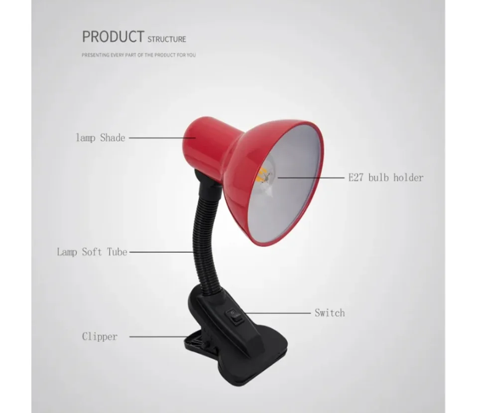 INFORMAÇÕES DO PRODUTONome do produto: clipe na lâmpada de mesaTamanho do produto: Altura 280cm Comprimento da linha 80cmCor do produto: Azul, Verde, Rosa, Preto, Roxo, Branco, VermelhoO pacote inclui: 1 clipe na lâmpada de mesa (lâmpada não incluída)